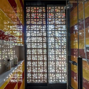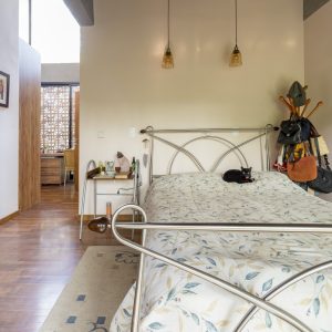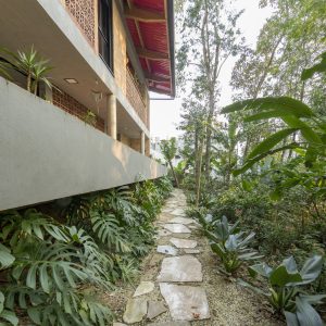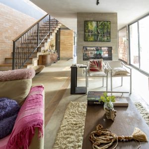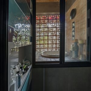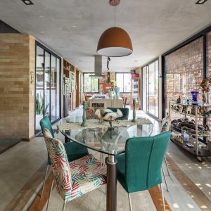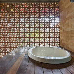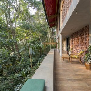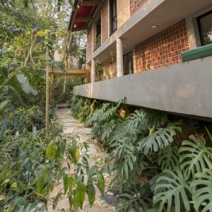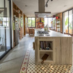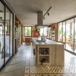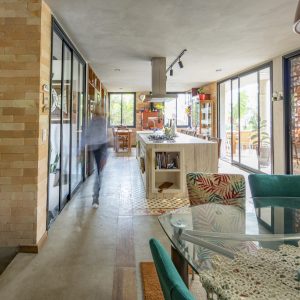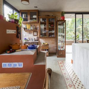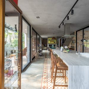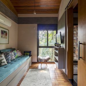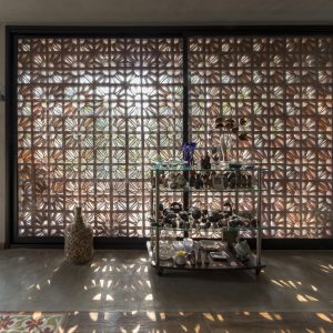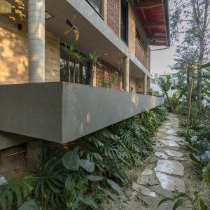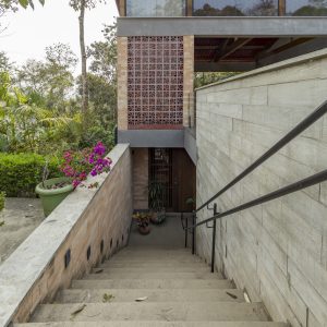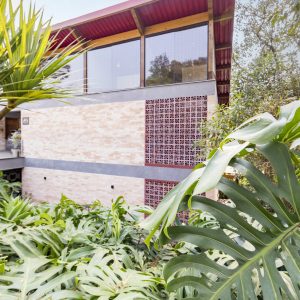 A casa também reutiliza a agua da chuva e capta a energia solar, além de se resfriar naturalmente pela ventilação cruzada e pelos grandes vãos protegidos pelos cobogós.