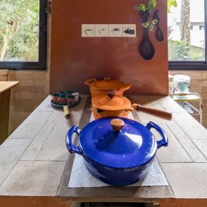 Os materiais empregados são simples como o tijolo de barro, cobogós cerâmicos, concreto aparente, cimento queimado e os ladrilhos hidráulicos mesclados com a alta tecnologia do MLC (Madeira Laminada Colada), das telhas metálicas termo acústicas e esquadrias de alumínio com persianas automáticas, uma mistura entre inovação e tradição. Os ambientes também brincam com esta relação do velho com o novo, como a cozinha moderna que possui um fogão a lenha e se abastece da sua horta particular.